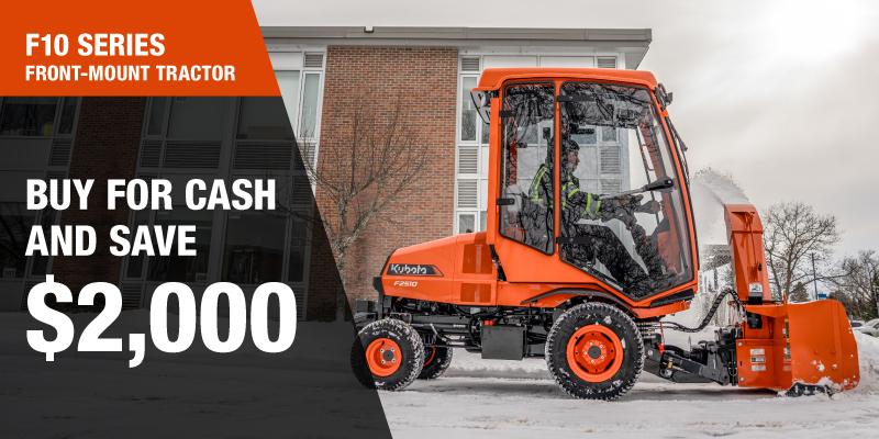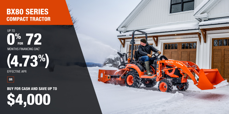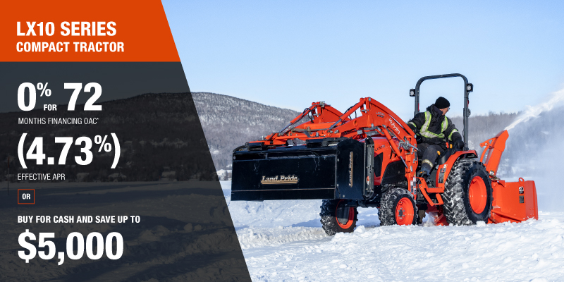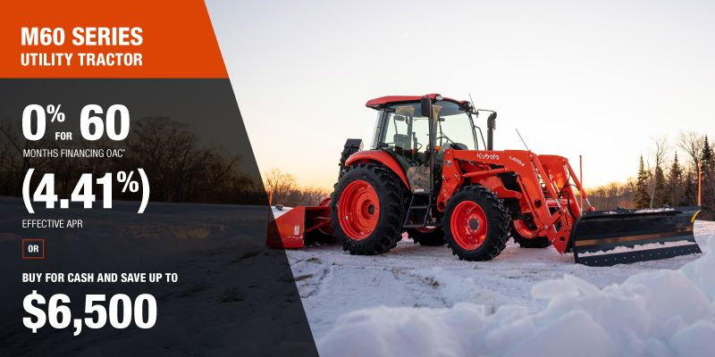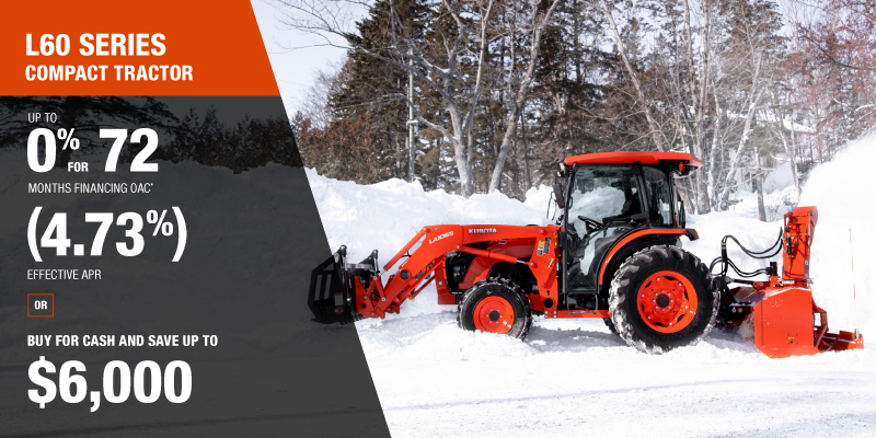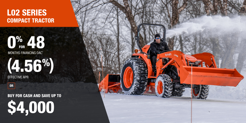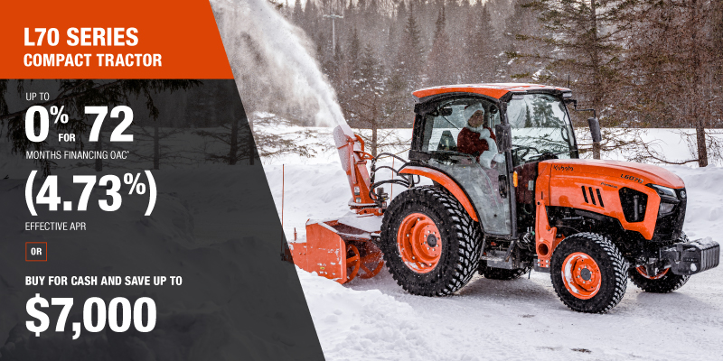 *For all offers: Prices and payments include freight and other applicable fees (including environmental fees, administration fees, set-up fees, and dealer fees). Taxes, delivery fees, insurance and registration are extra. Dealer may sell for less. Dealer order/trade may be necessary (but may not be available in all cases). Some restrictions apply. Offers valid only at participating dealers in Canada and are subject to change, cancellation or extension at any time without notice or obligation. Minimum down payment of 10% required for financing offers on turf and agricultural products. Specifications, features, illustrations and equipment shown are based on the latest available information at the time of publication. Some models are shown with optional accessories available at extra cost. Although descriptions are believed to be correct, accuracy cannot be guaranteed. We reserve the right to make changes at any time, without notice or obligation to specifications, accessories, materials, models, prices, payments and other information. Offer valid until March 31, 2026. See your participating Kubota dealer or visit www.kubota.ca for complete details.