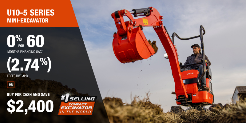 Representative finance example for the U10-5: $40,107.11 financed at 0% (2.74% effective APR which factors in $2,400.00 in non stackable cash that cannot be combined with finance offers) equals $601.89 monthly for 60 months. $4,012.62 down payment required. Cost of borrowing is $2,400.00 for a total obligation of $40,107.11. Financing available on approved credit. Prices and payments include freight and other applicable fees (including environmental fees, administration fees, set-up fees, and dealer fees on the model specified). Excavator Claim: "Kubota is the world’s #1 selling compact excavator for 20 years." Disclaimer: According to 2023 data from Off-Highway Research including all Kubota Group brand sales. Offer valid until 06-30-2026.