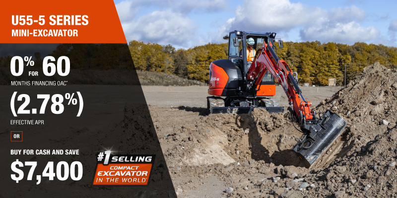Representative finance example for the U55-5: $122,059.55 financed at 0% (2.78% effective APR which factors in $7,400.00 in non stackable cash that cannot be combined with finance offers) equals $1831.78 monthly for 60 months. $12,211.84 down payment required. Cost of borrowing is $7,400.00 for a total obligation of $122,059.55. Financing available on approved credit. Prices and payments include freight and other applicable fees (including environmental fees, administration fees, set-up fees, and dealer fees on the model specified). Excavator Claim: "Kubota is the world’s #1 selling compact excavator for 20 years." Disclaimer: According to 2023 data from Off-Highway Research including all Kubota Group brand sales. Offer valid until 06-30-2026.