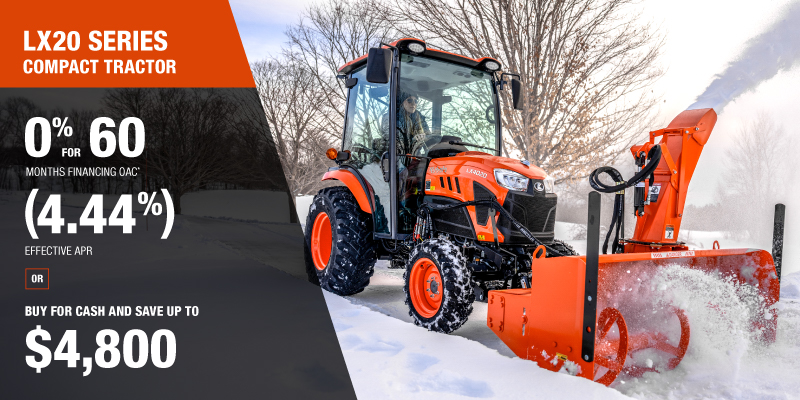 Representative finance example for the LX2620HSDCC : $42,199.91 financed at 0% (4.44% effective APR which factors in $3,949.91 in non stackable cash that cannot be combined with finance offers) equals $292.15 bi-weekly for 60 months. 130 payments required bi-weekly for 60 months. $4,219.99 down payment required. Cost of borrowing is $3,949.91 for a total obligation of $42,199.91. Financing available on approved credit. Prices and payments include freight and other applicable fees (including environmental fees, administration fees, set-up fees, and dealer fees on the model specified). Rebate of $2,400 available on cash purchases of a new LX2620 Rops only. Rebate of $3,200 available on cash purchases of a new LX3520 Rops only. Rebate of $3,500 available on cash purchases of a new LX4020 Rops only. Rebate of $3,500 available on cash purchases of a new LX2620 Cab only. Rebate of $4,500 available on cash purchases of a new LX3520 Cab only. Rebate of $4,800 available on cash purchases of a new LX4020 Cab only. Offer valid until 03-31-2026.