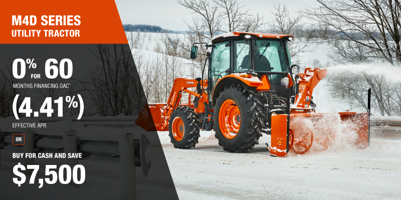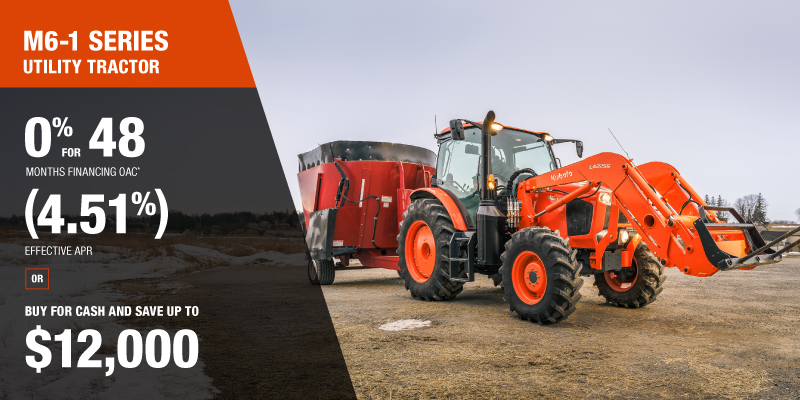 Discount shown available on a new and previously unregistered M8 is $10000.00. Offer cannot be applied on past transactions, and has no cash surrender value. The 4 year/4,000h warranty on M8 offer is only valid in Canada on products distributed by Kubota Canada Ltd. Discount(s) apply before tax. Offer cannot be applied on past transactions, and has no cash surrender value. Offer valid until 03-31-2026.