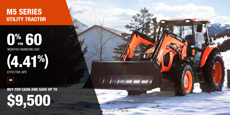 Representative finance example for the M5-091HDRC: $88,473.79 financed at 12% (4.41% effective APR which factors in $8,388.14 in non stackable cash that cannot be combined with finance offers) equals $1344.25 monthly for 60 months. $8,961.69 down payment required. Cost of borrowing is $8,388.14 for a total obligation of $88,473.79. Financing available on approved credit. Prices and payments include freight and other applicable fees (including environmental fees, administration fees, set-up fees, and dealer fees on the model specified). Rebate of $7,500 on a available on cash purchases of a new M5 Rops only. Rebate of $9,500 available on cash purchases of a new M5 Cab only. Offer valid until 03-31-2026.
